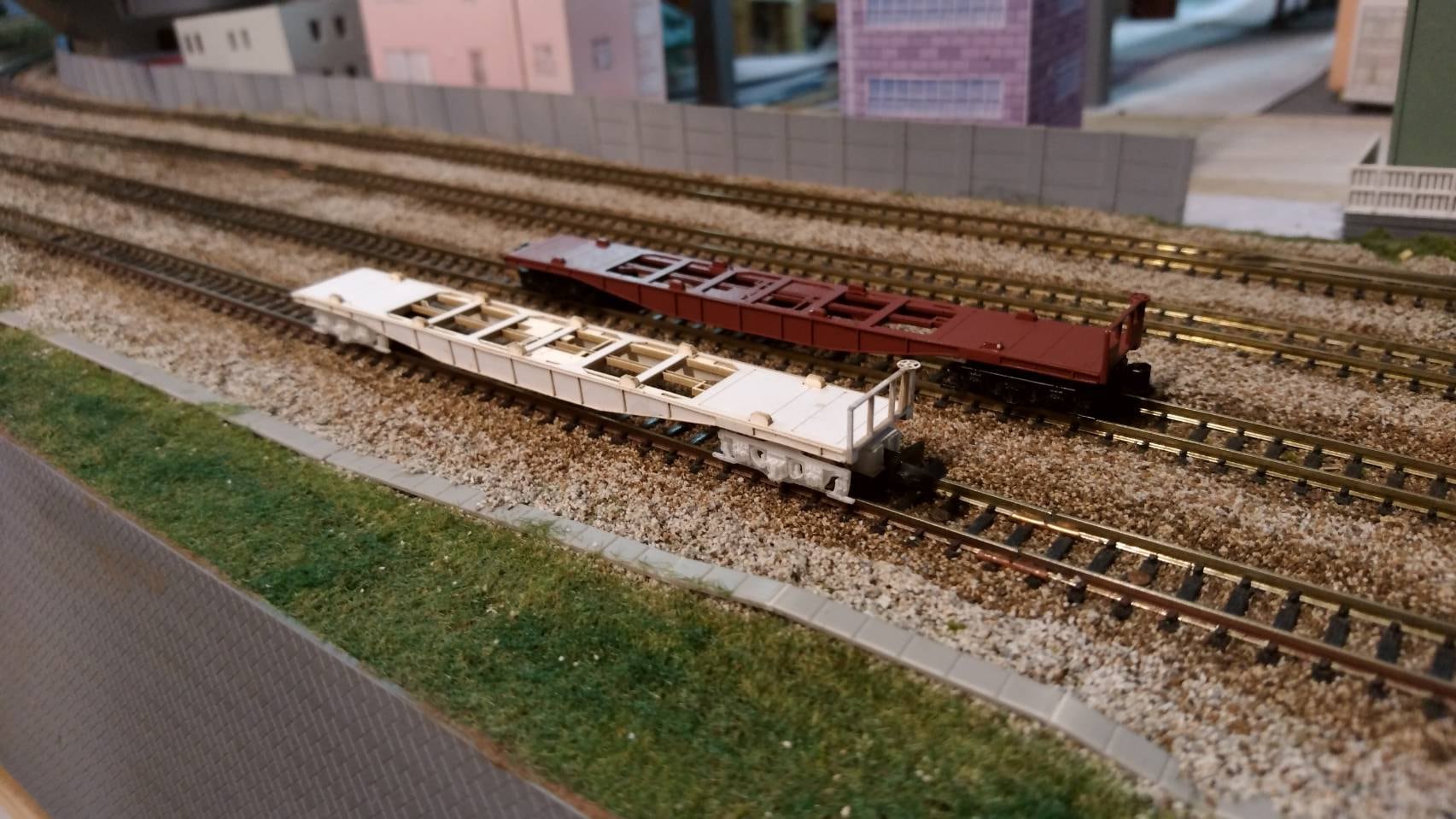 レーザー切り抜き済み、1/150(Nゲージ)コキ5500(初期型)コンテナ4個積みのペーパーキットです。